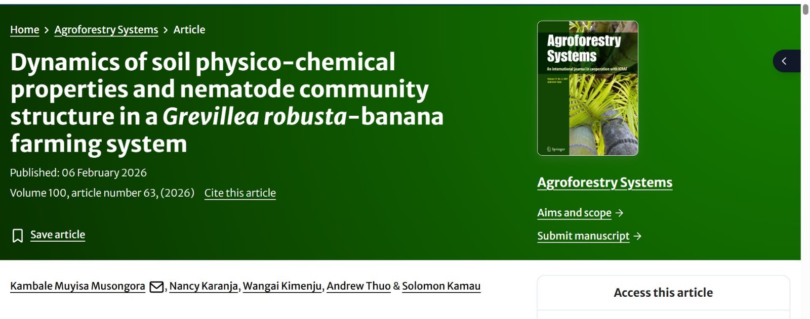« Dynamics of soil physico-chemical properties and nematode community structure in a Grevillea robusta–banana farming system » est cet article paru le 06 février 2026 avec pour auteur principal Kambale Muyisa Musongora  enseignant en faculté de sciences Agronomiques de l’Université Catholique du Graben et doctorant à Universty Of Nairobi.