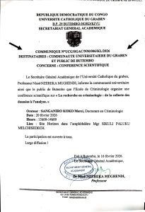 L’Université Catholique du Graben (UCG), à travers son École de Criminologie, organise une conférence scientifique intitulée : « La recherche en criminologie : de la collecte des données à l’analyse ».