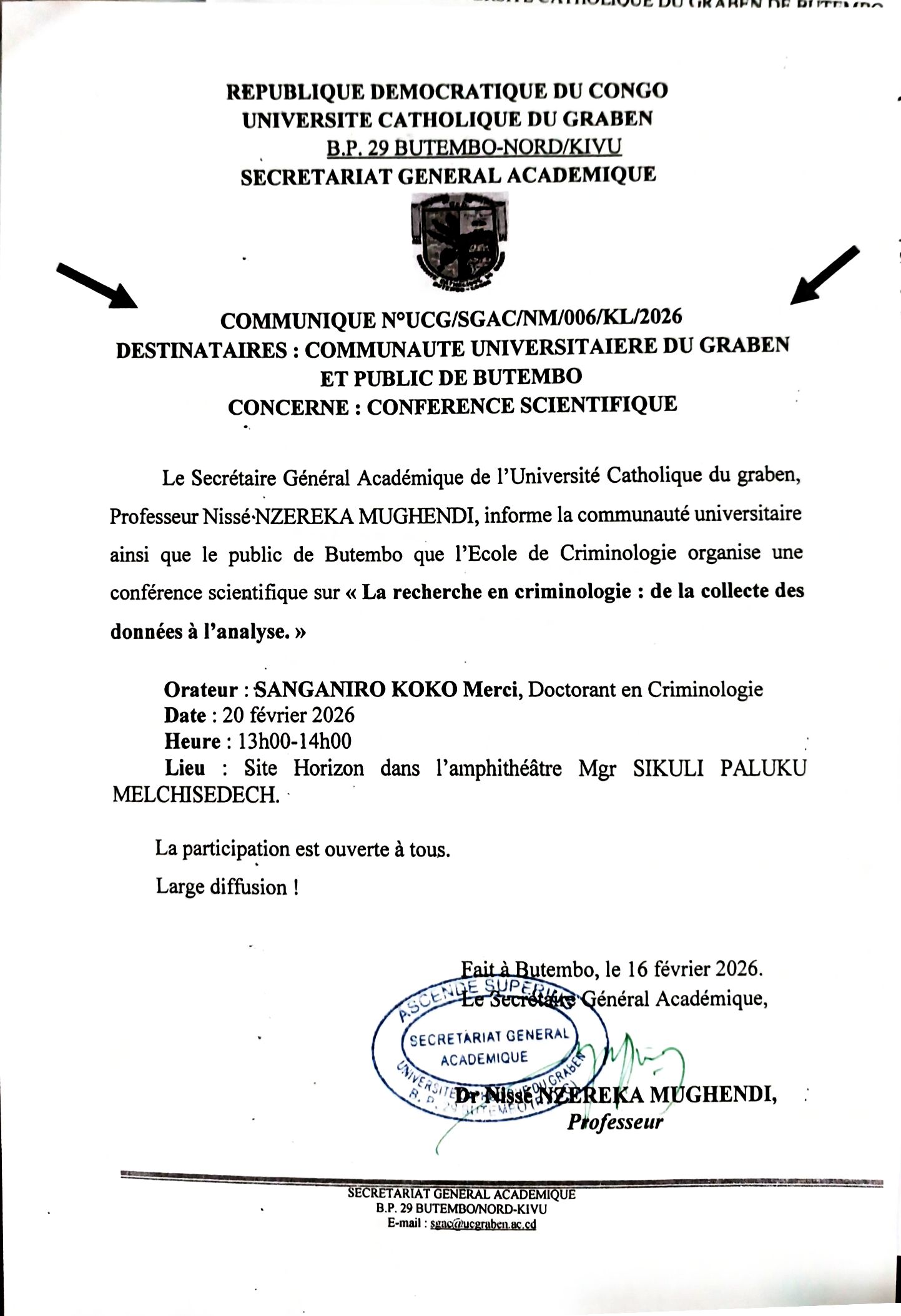 Selon le communiqué officiel du Secrétariat Général Académique, signé par le Professeur Dr Nissé NZEREKA MUGHENDI, cette activité scientifique s’inscrit dans la dynamique de promotion de la recherche et du renforcement des capacités méthodologiques des étudiants, chercheurs et praticiens du droit pénal et des sciences criminologiques.