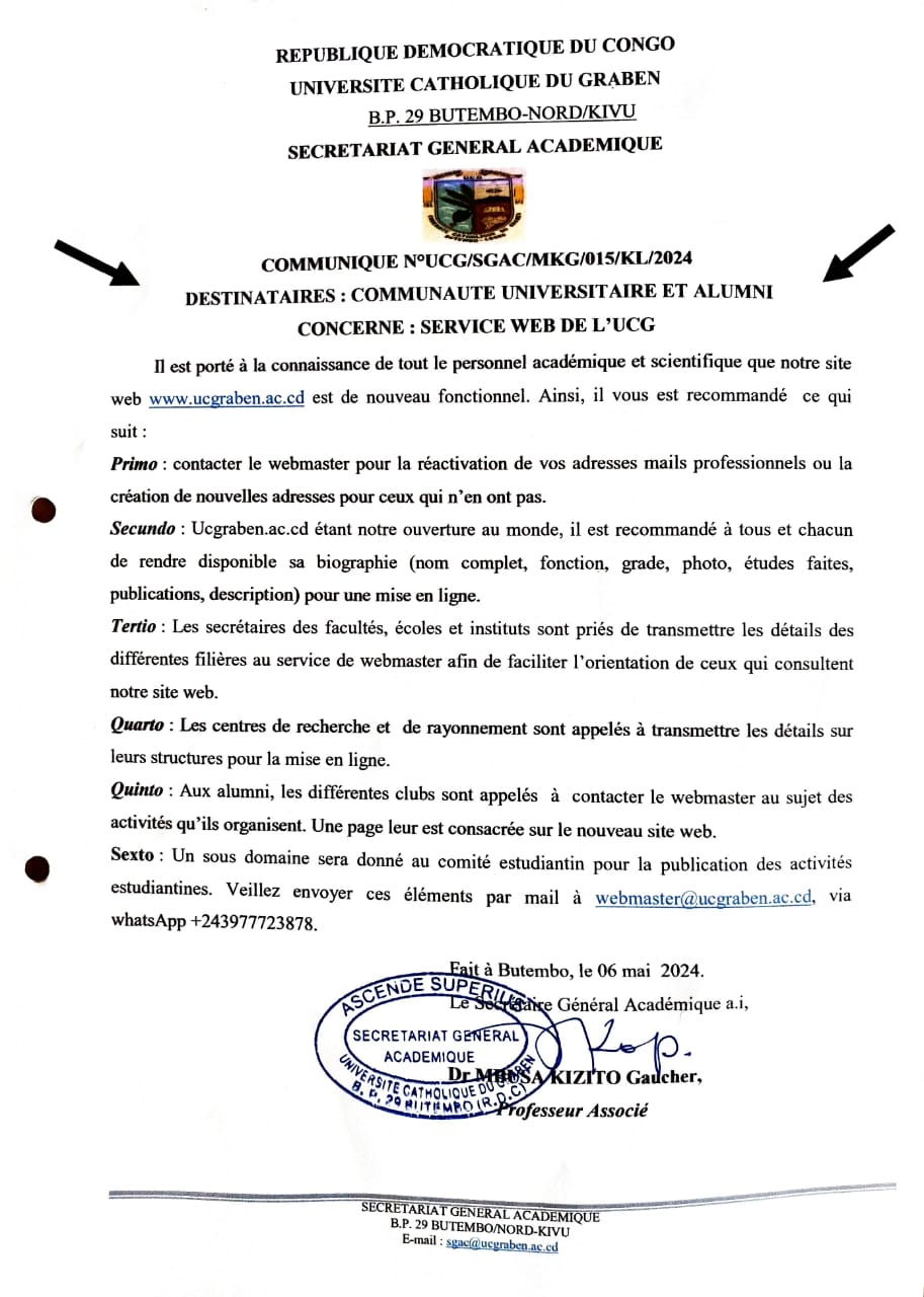 Le Recteur de l’UCG, le P.O. Mafikiri Tsongo Angélus invite la communauté universitaire de l’UCG, de Butembo et partout ailleurs de venir participer à la soutenance publique de la thèse de doctorat du Chef de Travaux Kilangalanga Ngoy Janvier en …