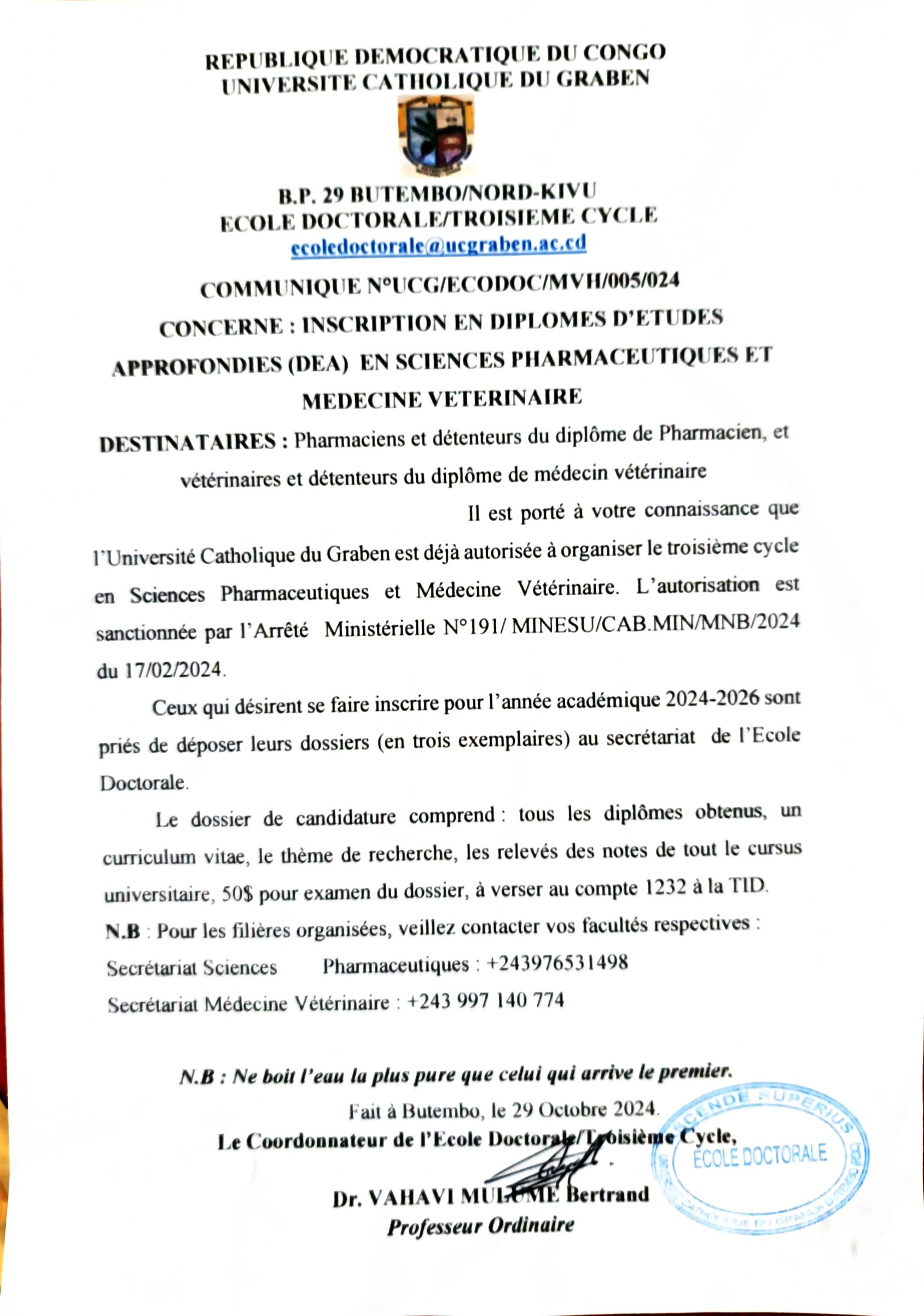 COMMUNIQUE N°UCG/ECODOC/MVH/005/024 CONCERNE : INSCRIPTION EN DIPLOMES D’ETUDES APPROFONDIES (DEA) EN SCIENCES PHARMACEUTIQUES ET MEDECINE VETERINAIRE DESTINATAIRES : Pharmaciens et détenteurs du diplôme de Pharmacien, et vétérinaires et détenteurs du diplôme de médecin vétérinaire Il est porté à votre connaissance que l’Université …